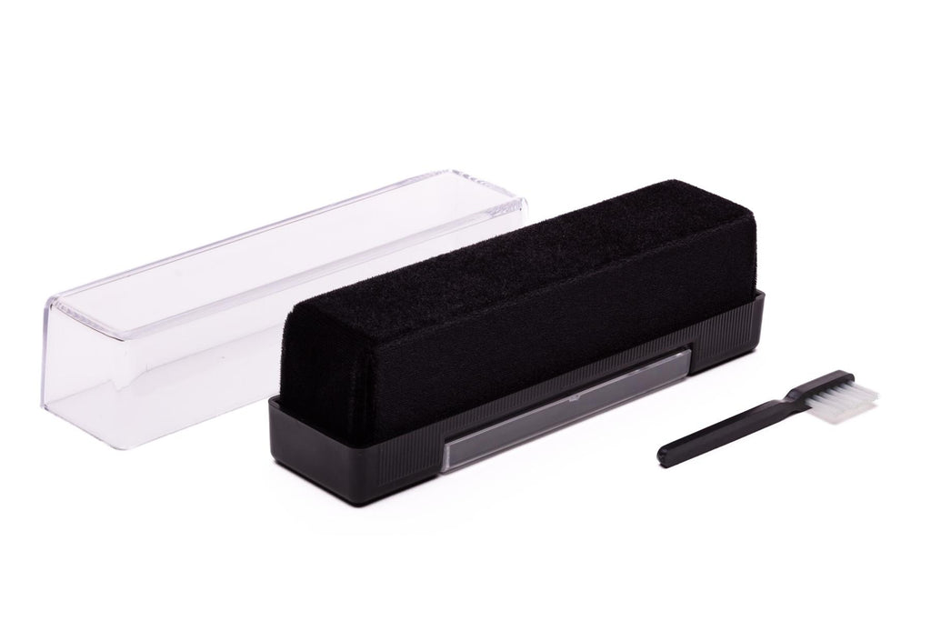 The brush is supplied with a protective plastic cover to keep the velvet clean when not in use. Additionally, a small stylus cleaning brush is included, allowing convenient needle maintenance as part of regular record care.